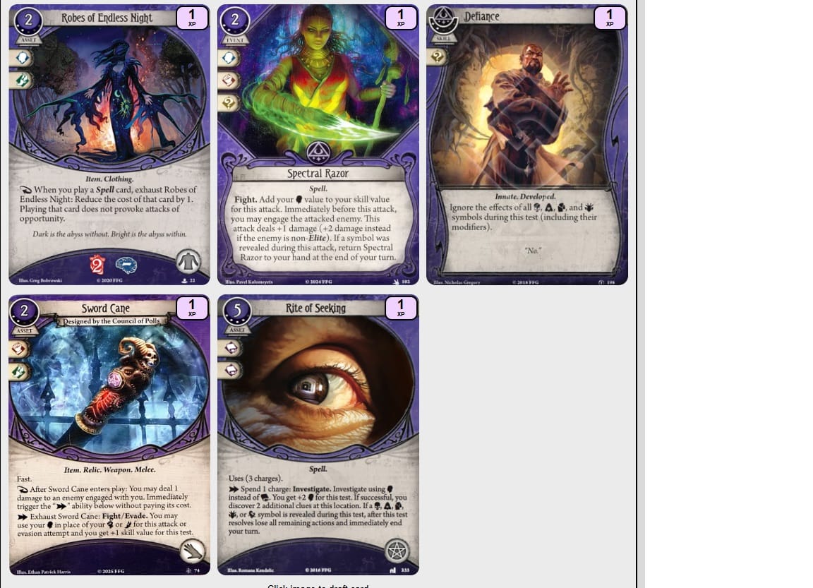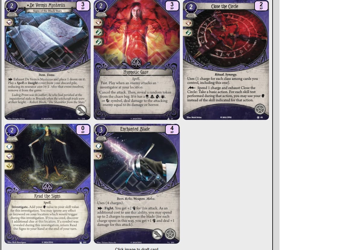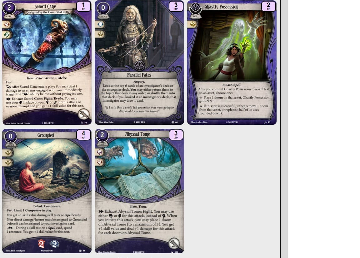 Look, Mr. Draft App, I don't want to be a better fighter, capiche? A little bit of tutoring with Parallel Fates can't hurt; it still leaves me with a single point to spend. Delve Too Deep was dropped for it. I'm not hurting for xp and the lack of skill signs doesn't help this deck.