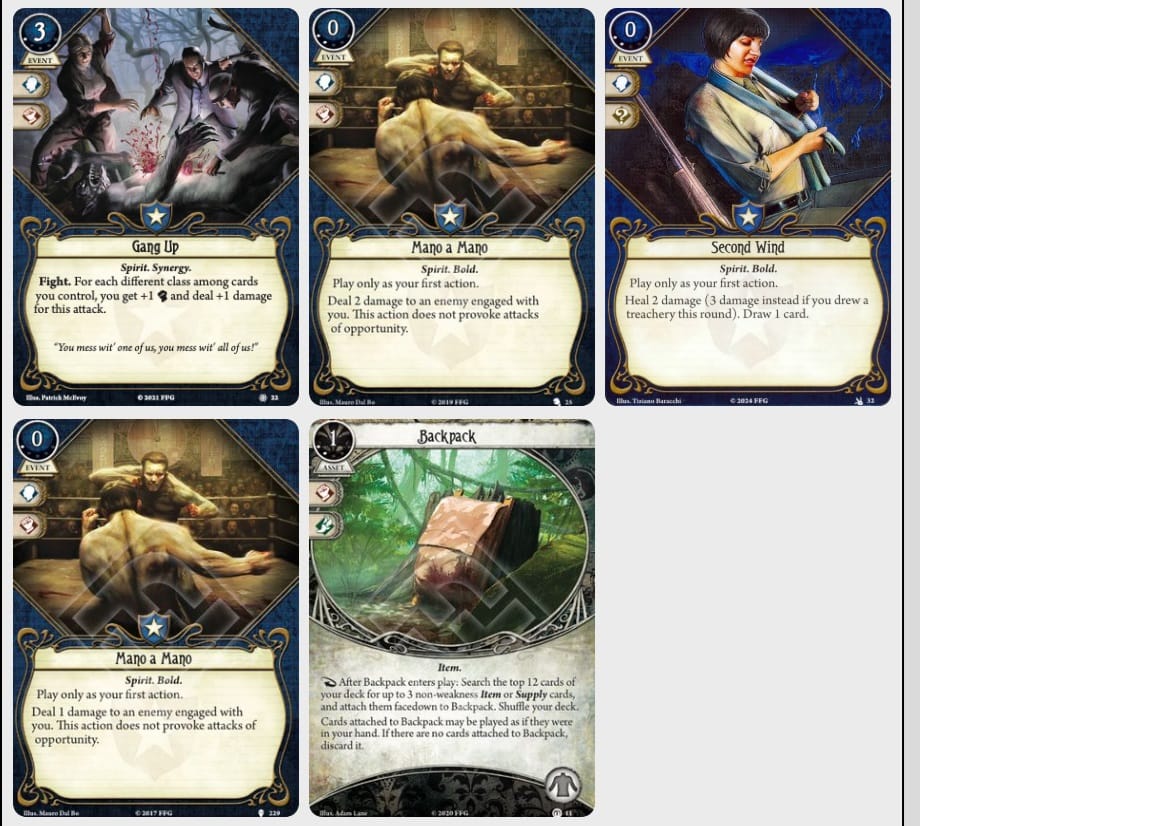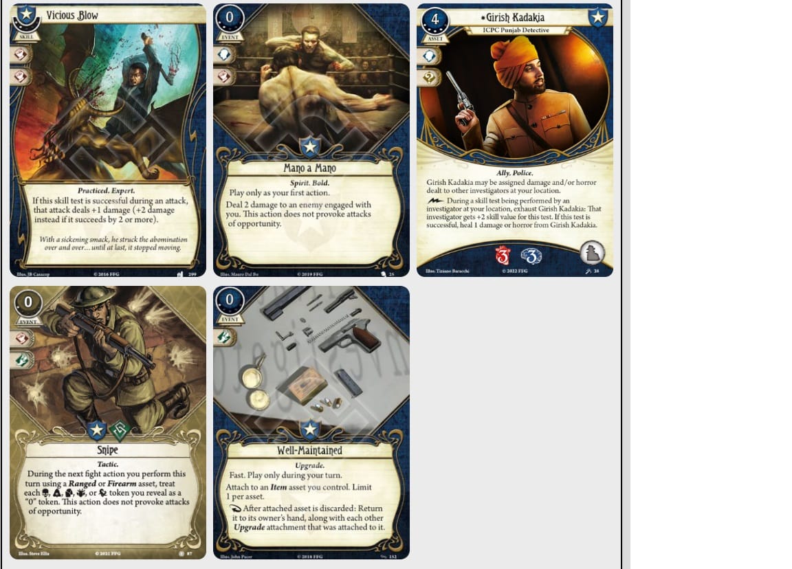 Oh, hello there, Vicious Blow! Mano a Mano is an interesting card, but Vicious Blow feels more versatile. I like Girish, but it didn't feel right to spend all my xp on a single card. The other two cards are more fitting in a firearms-based deck, that's not what I am running. Emergency Cache was dropped. After two scenarios, I feel confident it is not needed.